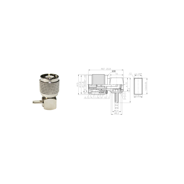 周波数範囲(GHz) 11 インピーダンス(オーム) 50 VSWR 1.15 テスト電圧(最大) 2500 V PIM(3次) ≤-160 dBc @ 2 x 20 W 嵌合サイクル ≥ 500 結合トルク最大 1.7 Nm 推奨結合トルク 0.7-1.1 Nm 温度範囲 -55℃-+155℃外側コンタクト 黄銅 CuSnZn メッキ センターコンタクト 黄銅 Ag メッキ ケーブルグループ N/A メッキ CuSnZn 長さ(mm) Ф15*25.8*18.4